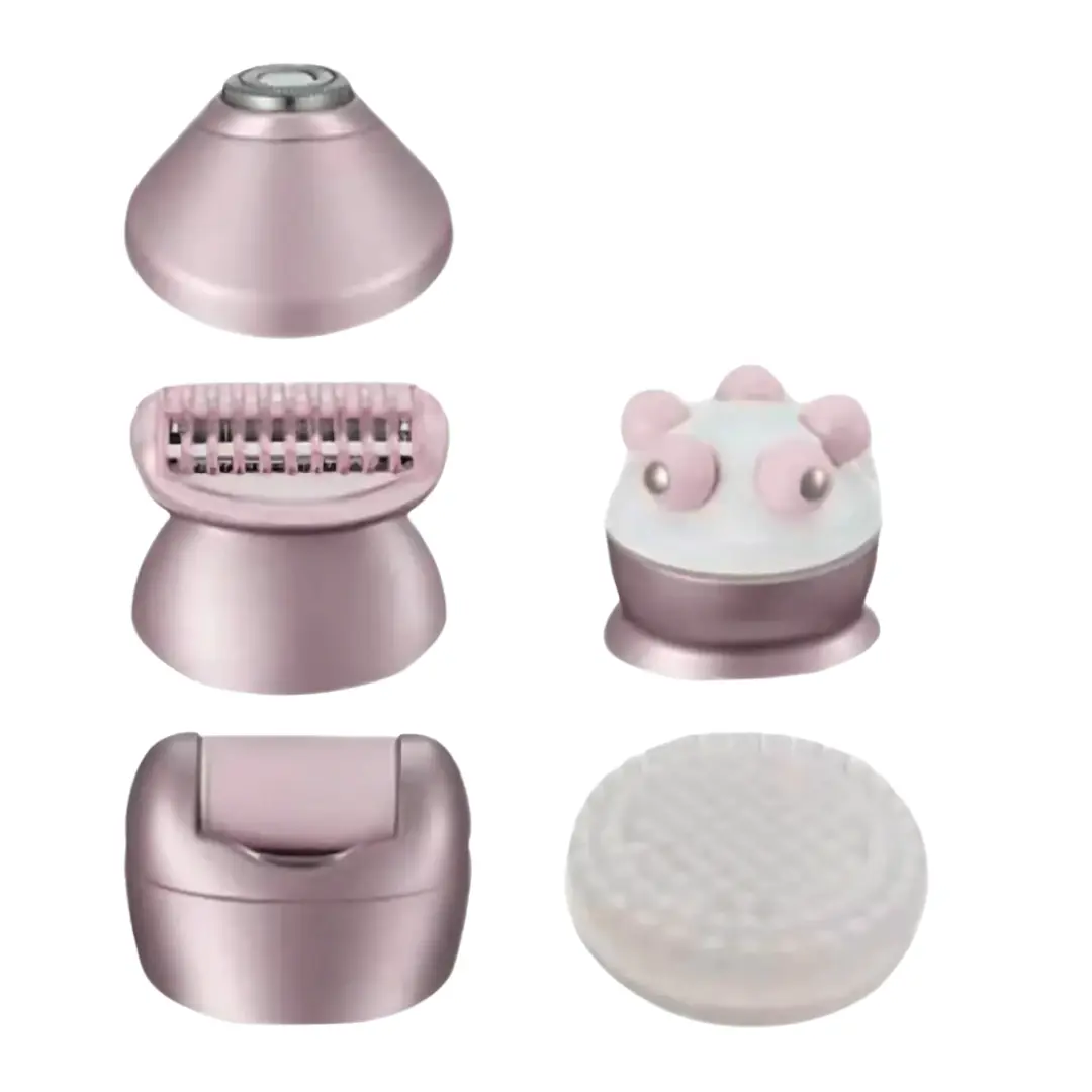 Multifunción 6 en 1: Incluye cabezales intercambiables para diversas necesidades: depilador, rasurador, recortador, masajeador, removedor de callos/exfoliador y un cabezal de masaje de alta frecuencia.